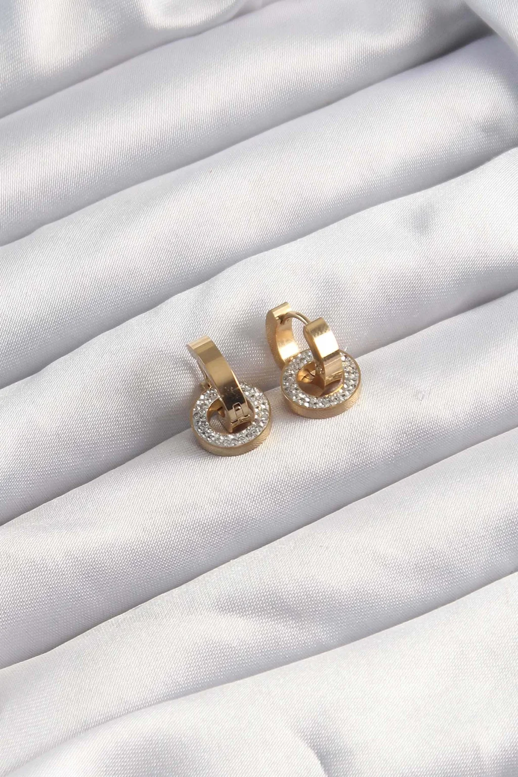 316L Çelik Gold Renk Zirkon Taşlı Halka Model Kadın Küpe Seti
