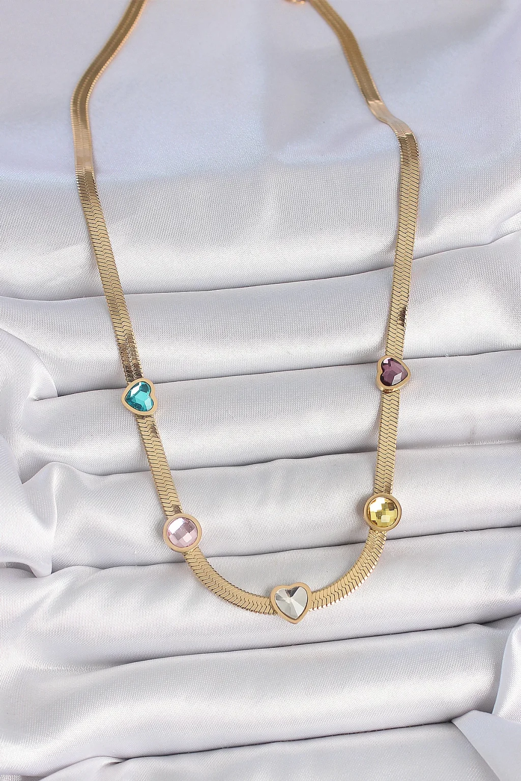 316L Çelik Gold Renk İtalyan Zincir Renkli Zirkon Taşlı Kalp Figür Kadın Kolye