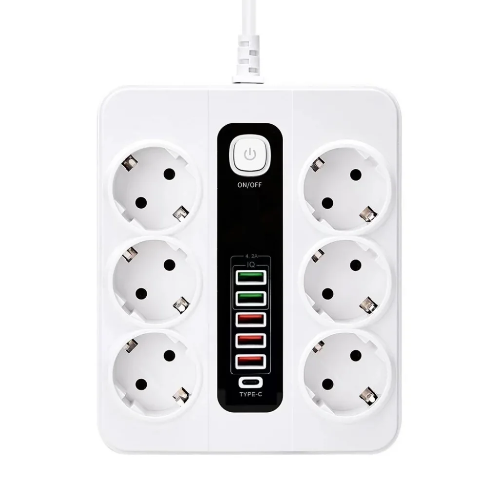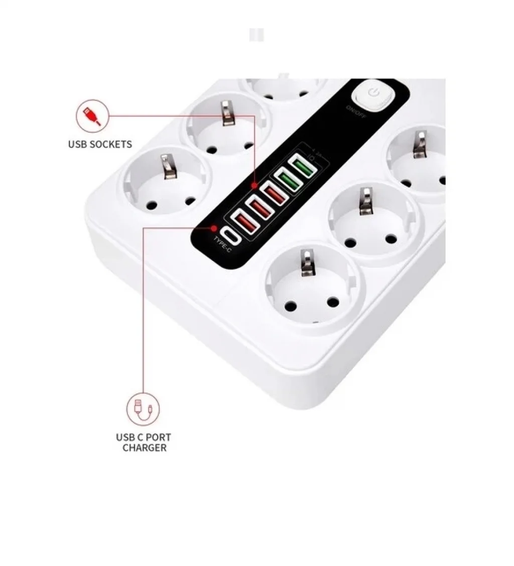 Birden fazla cihazı ve cihazı aynı anda şarj edebilen 4 EU AC Jack, 4 USB-A,2 Type C bağlantı noktasına sahiptir.