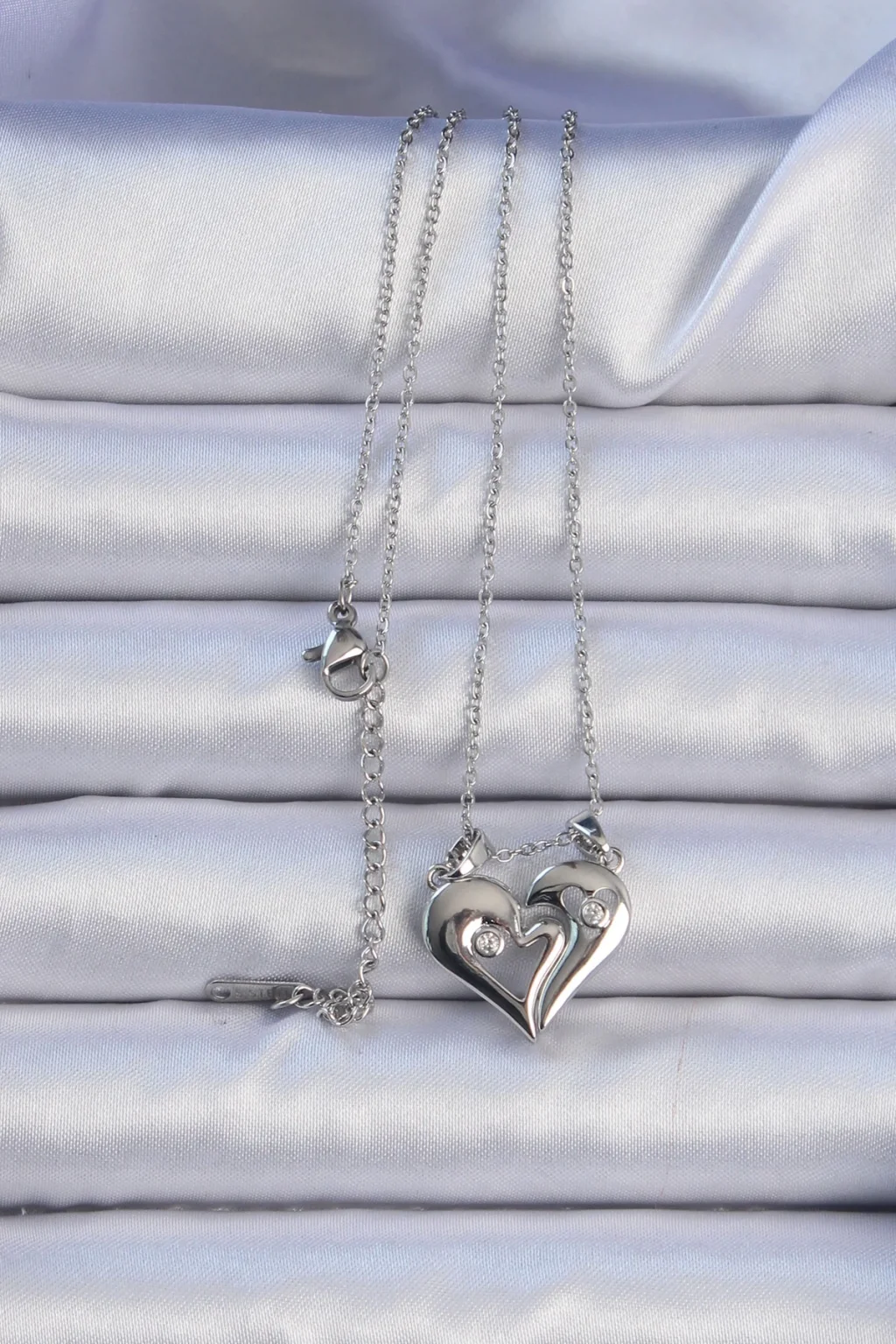 316L Çelik Zincir Gümüş Renk Zirkon Taşlı Mıknatıslı Kalp Kolye