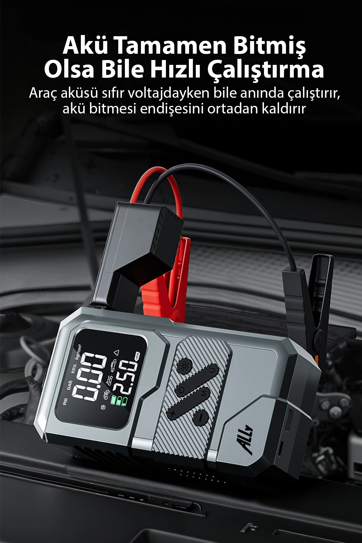 Ally ST-9654 Akıllı Hava Kompresörü + Acil Marş Güç Kaynağı (Hepsi Bir Arada) Yolda kalma derdine son! Ally ST-9654, marş güç kaynağı, hava kompresörü, dijital lastik basınç göstergesi ve acil durum aydınlatmasını tek cihazda birleştirir.