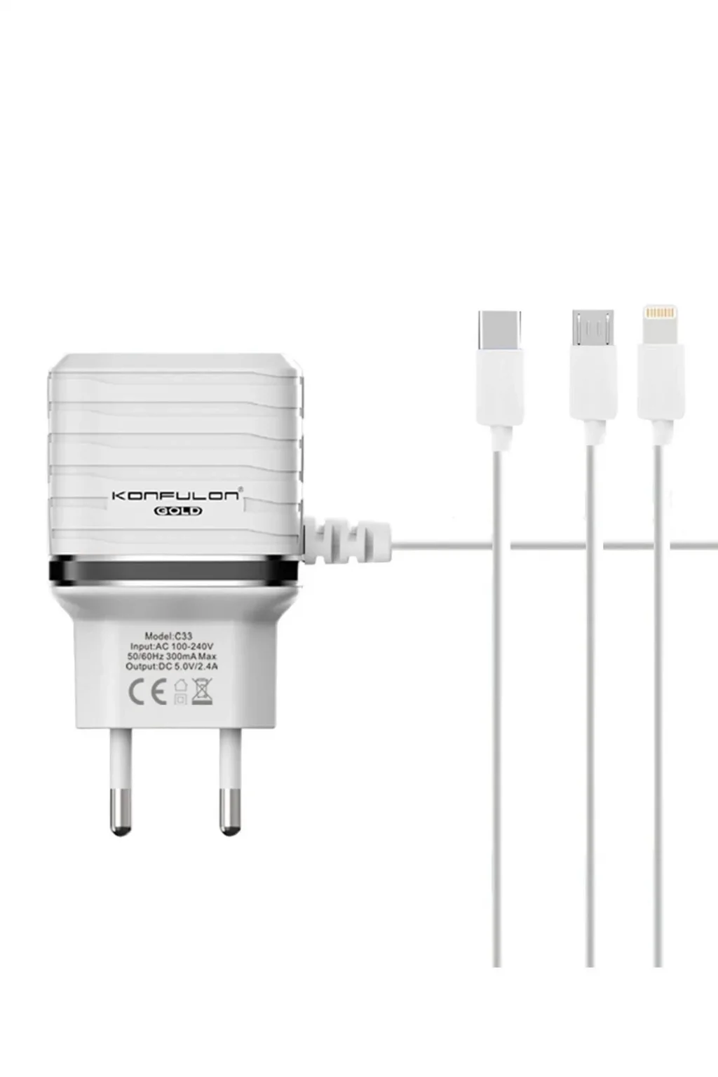 C33 Şarj Aleti, dahili Micro USB kablosu ile birlikte gelmektedir. Ayrıca iki adet USB çıkışı ile Lightning veya Type-C kablo bağlayarak aynı anda 2 cihazı sorunsuz bir şekilde şarj edebilirsiniz.
