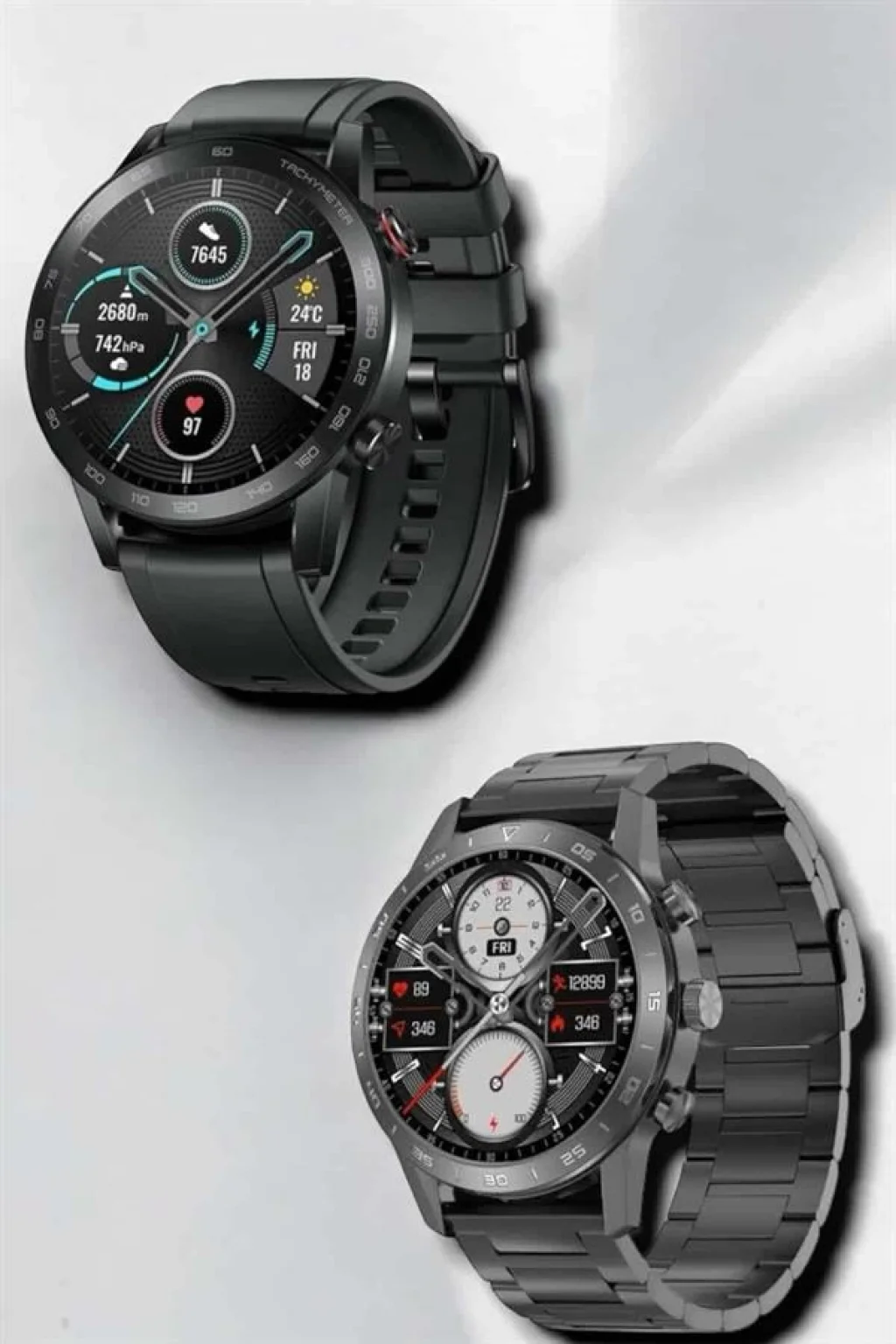 Akıllı Saatte Sağlık, Spor ve Konfor Bir Arada!Yeni nesil akıllı saat, gelişmiş özellikleriyle günlük yaşamınıza değer katar:• Bluetooth 5.0 & Sesli Asistan: Hızlı ve güvenilir bağlantı ile aramalarınızı yönetin, bildirimlerinizi kontrol edin ve sesli asistanla işlemlerinizi kolaylaştırın.• Sağlık Yönetimi: EKG, tansiyon, nabız ölçümü, vücut sıcaklığı kontrolü ve uyku takibi ile sağlığınızı her an izleyin.• Spor Modları ve Kalori Takibi: Farklı spor modları ile antrenmanlarınızı optimize edin ve harcadığınız kaloriyi takip edin.• Suya Dayanıklı ve NFC Desteği: Suya dayanıklılığıyla her ortamda kullanabilir, NFC özelliği ile temassız ödeme yapabilirsiniz.• Yüksek Çözünürlüklü Dokunmatik Ekran: Büyük ve net ekranıyla tüm detaylara hakim olun.• Kablosuz Şarj: Pratik kullanım için kablosuz şarj imkanı sunar.• Şık Çift Kordon Tasarımı: Farklı stiller için iki farklı kordon seçeneği sunar.Bu akıllı saat, iOS ve Android uyumluluğuyla tüm cihazlarınızla sorunsuz bir şekilde çalışır. Hem günlük hayatınızda hem de spor aktivitelerinizde vazgeçilmez bir teknoloji ürünü!