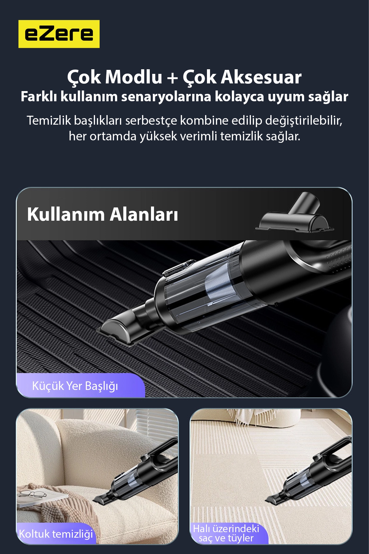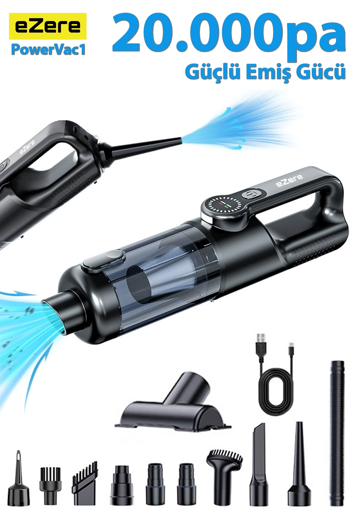 eZere PowerVac1, 20.000 Pa güçlü emiş gücü, turbo tip fırçasız motoru ve çoklu başlık sistemi sayesinde araç içi, ev ve dar alan temizliğinde maksimum performans sunar.