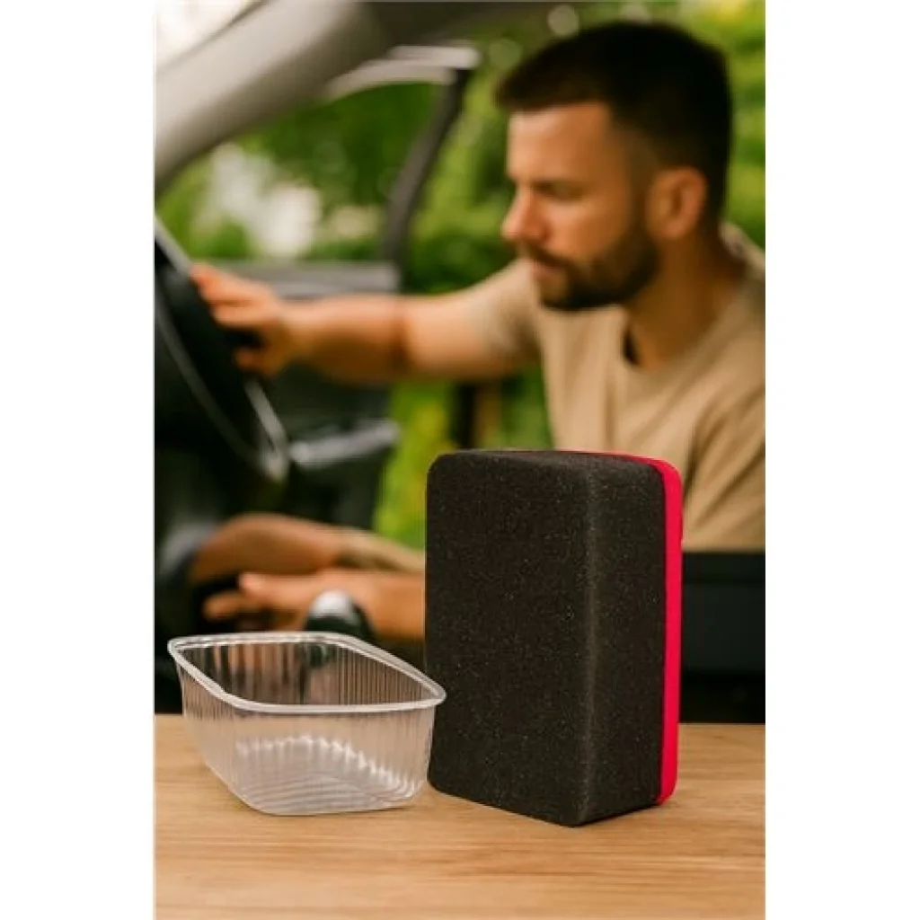 Bu araç içi temizlik süngeri ve şeffaf kap seti; torpido, direksiyon, kapı içi ve konsol gibi yüzeylerde toz alma, parlatma ve bakım işlemleri için idealdir.