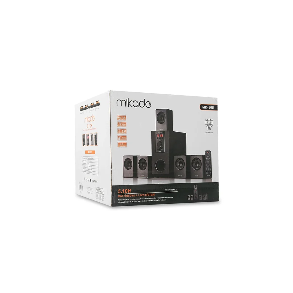 Açıklama5+1 Multimedya Ev Sinama SistemiMarkaMikadoModelMD-505RenkSiyahGiriş arayüzü3.5mm AUX/RCA Giriş/FM Radyo/SD Kart/USB/BluetoothKanal Yapısı5+1Hoparlör Sayısı6Hoparlör ÇapıBass Hoparlor: 13.50cm, Diğer Hoparlorler: 6.5cmFrekans cevabı40Hz-20KHzGüç Çıkışı70 Watt (20Watt + 10Watt x 5)Ayırma= 50dBS / N Oranı= 75dBEneji Beslemesi AC 220-240V, 50-60HzFm RadyoVarBluetoothVarUsbVar USB Tip A 2.0Kart OkuyucuVarHoparlör6 Adet (Bass: 20W, Diğerleri: 10W)Ses AyarıVarBoyutAna ünite: 290mm x 162mm x 270mm, Uydular: 132mm x 90mm x 79mm (5 Adet)Kablo UzunluğuAC Kablo: 134,5cm, RCA Kablo: 111cm, Hoparlorler Arası Kablo: 360cm, Anten: 146cmKutu Boyutu30,6cm x 33.5cm x 29.5cmKutu İçeriğiÜrün+AUX/RCA Dönüştürücü+RCA Kablo+Kumanda+Kullanım Kılavuzu+AntenMalzemeAhşap, PlastikAğırlık4149grMikado MD-505 5+1 Usb+SD+FM Destekli Bluetooth Speaker ; 1 Adet 70Watt ve 5 Adet 10*5Watt hoparlörü sayesinde kaliteli ve yüksek sesi sizin ile buluşturuyor. Özenle tasarlanmış olan MD-505 dayanıklı yapısı ve şık tasarıma sahip olup aygıtlarınız için en uygun hoparlörlerden biridir. Fm özelliği sayesinde radyo kanallarını rahatlıkla dinlemenize imkan tanır ! Kaliteli malzemesi ve şık düzaynı ile göz kamaştıran bir üründür.Mikado MD-505 5+1 Usb+SD+FM Destekli Bluetooth Speaker ; 3MM JAK çıkışı bulunan tüm aygıtlarınıza rahatlık ile bağlayıp kaliteli ve temiz ses almanıza imkan tanır. MD-505'i Laptop, Masaüstü bilgisayarınızda adaptörü ile çalıştırarak mp3 çalar, akıllı telefon tablet vb. uygun çıkışları bulunan tüm aygıtlarınızda sorunsuz olarak kullanabilirsiniz. Hoparlörler üzerindeki şık tasarımı ile ürüne hoş bir görünüm kazandırmış olup masanızda, evinizde, ve ürünü kullandığınız benzeri yerlerde görsel bütünlüğü asla bozmaz.Mikado MD-505 5+1 Usb+SD+FM Destekli Bluetooth Speaker ; 70Watt gücünde ki Subwoofer'ın ön yüzeyine yerleştirilmiş olan tuşlar sayesinde rahatlıkla istediğiniz işlemleri gerçekleştirebilirsiniz. Subwoofer kaliteli sesin odak noktası !Mikado MD-505 5+1 Usb+SD+FM Destekli Bluetooth Speaker ; Üzerinde bulunan fonksiyonel tuşlar ve uzaktan kumanda sayesinde dinlediğiniz müzikleri rahatlıkla ileri alabilir, durdurabilir, geri alabilirsiniz. Mode tuşu ile dilerseniz takmış olduğunuz Flashdisk ve SD karttaki muzikleri dilerseniz de aux ile bağlamış olduğunuz aygıtınızdaki müzikleri rahatlıkla dinleyebilirsiniz. Uzaktan kumandası sayesinde yerinizden kıpırdamadan rahatlıkla aynı işlemleri gerçekleştirmenize imkan tanır !Mikado MD-505 5+1 Usb+SD+FM Destekli Bluetooth Speaker ; Özenle dizayn edilmiş 5 adet satellite hoparlör sayesinde gücünüze güç katın.Mikado MD-505 5+1 Usb+SD+FM Destekli Bluetooth Speaker ; Harici belleklerinizi MD-505'e bağlayarak müzik dinlemenin tadını çıkarın. USB 2.0 ve SD kart giriş yuvaları sayesinde size farklı iki seçenek sunan MD-505'i Micro SD kartınızıda Micro SD kart adaptörü yardımı ile bağlayabilirsiniz.Mikado MD-505 5+1 Usb+SD+FM Destekli Bluetooth Speaker ; Tak çalıştır özelliği sayesinde kurulum gerektirmeden rahatlıkla aygıtlarınıza bağlayıp kullanabilirsiniz.