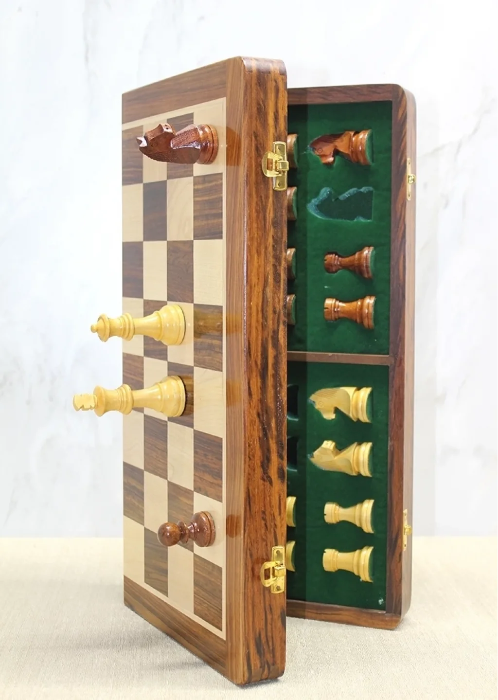 Özel Vernikli Mıknatıs Taşlı Ahşap Katlanabilir Kutulu Satranç Oyunu 12.5 Cm G220
