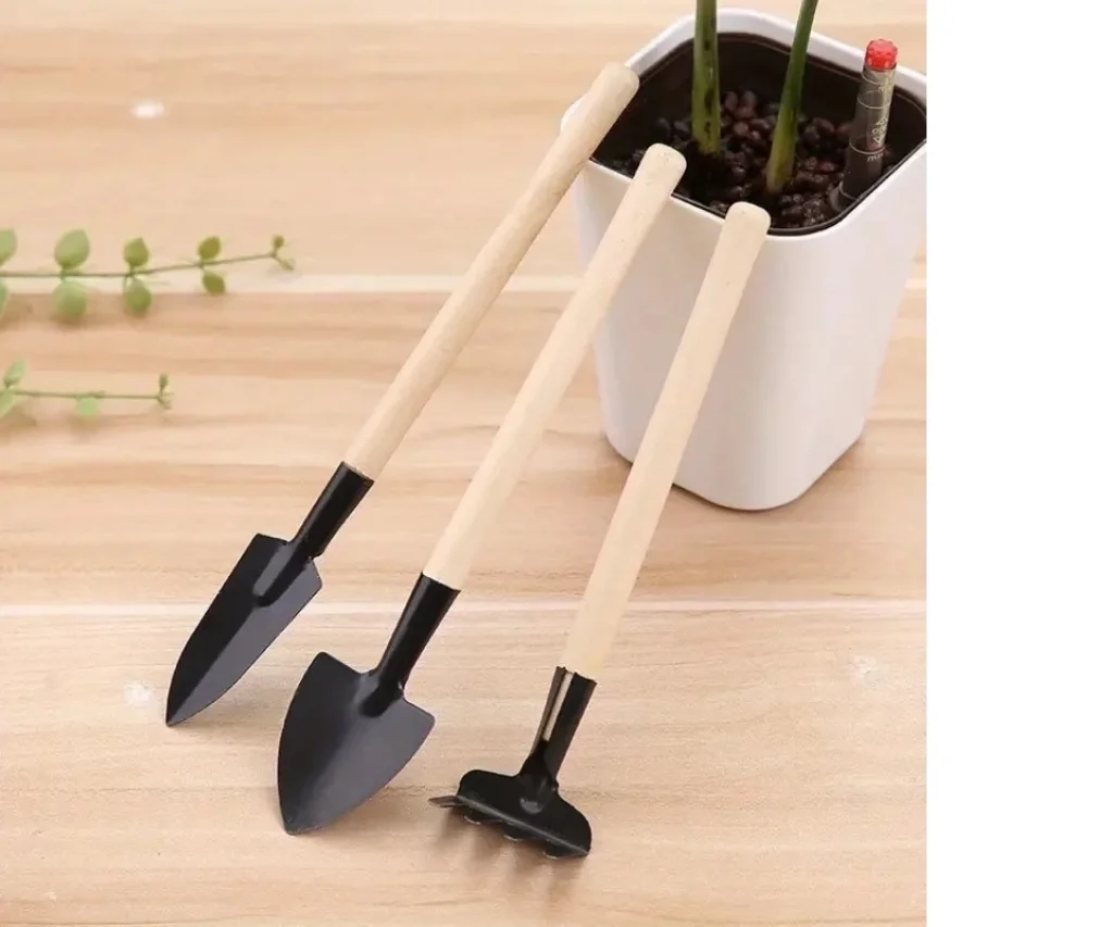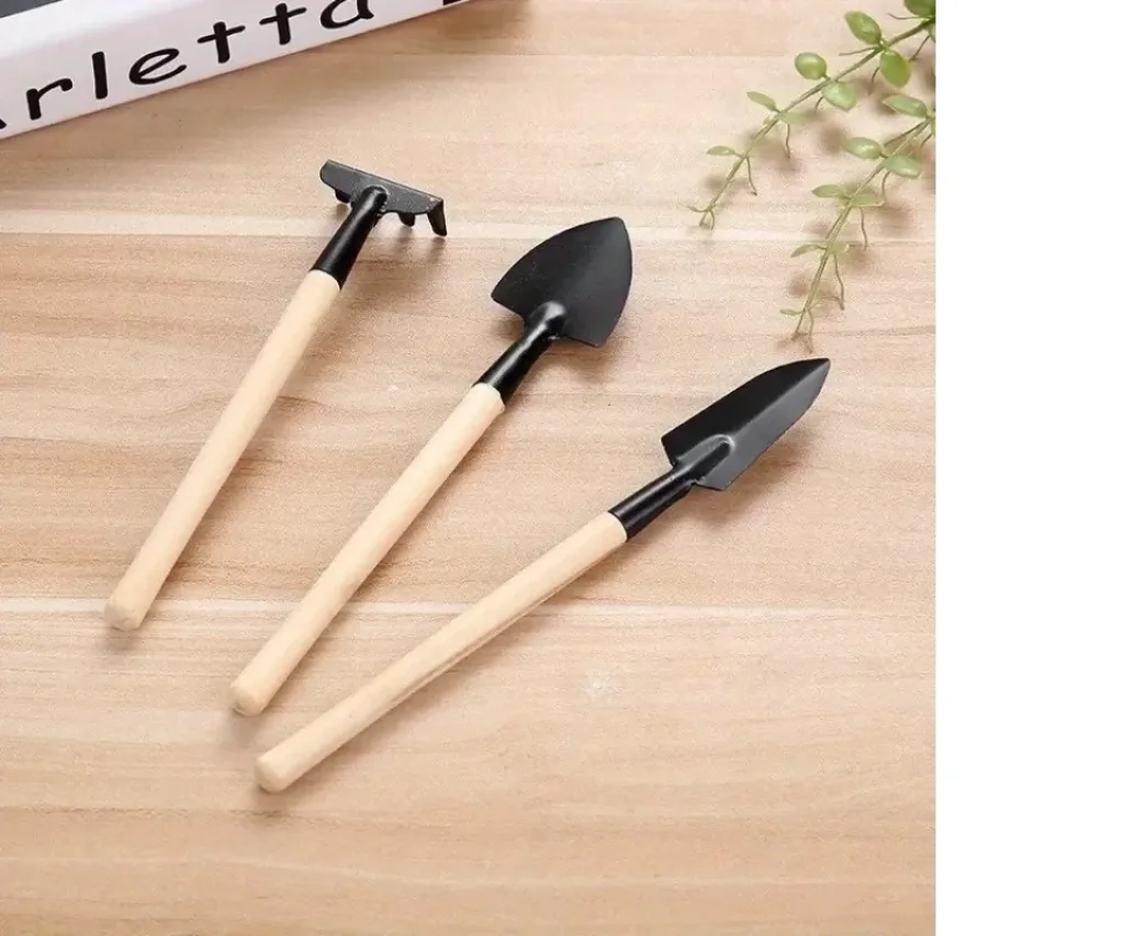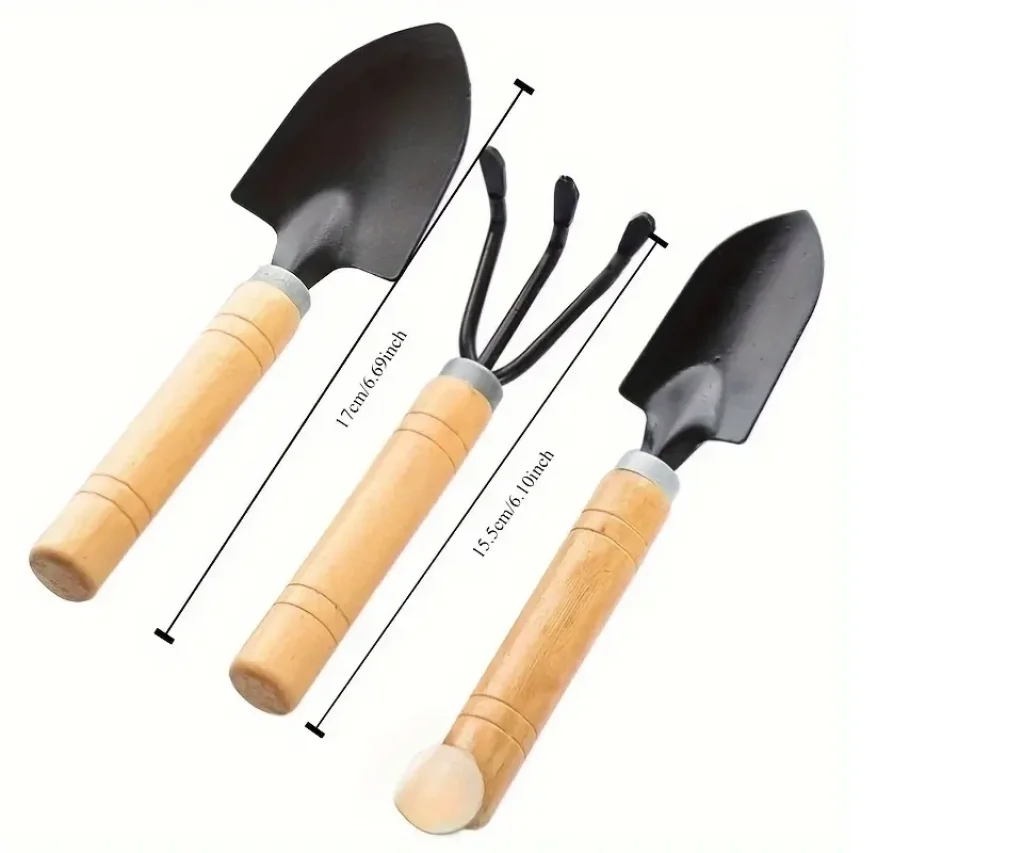 3 parça mini bahçe alet seti, tohum ekmek, sukulentler ve saksı malzemeleri için ahşap saplı çiçek tırmığı ve küçük kürek.