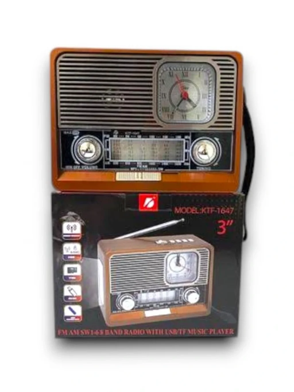 Saatli Fenerli Bluetooth lu USB li Nostaljik Radyo KTF 1647 Ebatları : 18 Cm Genişlik 7 cm Derinlik 14 Cm Yükseklik Saat ve Fener Aydınlatma Estetik ve nostaljik tasarım Dahili anteniyle hassas frekans kalitesi sunar Doğal ahşap görünümü kazandırılarak estetize edilmiştir 10 metre bağlantı mesafesi sunan Bluetooth özelliğe sahiptir Kullanışlı ses ve ayar düğmeleriyle rahat kullanım sunar 87 108 Mhz FM frekans aralığı Mp3 formatında USB müzik çalar özelliktedir USB ve TF kart girişine sahiptir Yeniden şarj edilebilir piliyle özgür kullanım sunar USB ve TF kart için şarkı oynatma tuşları mevcuttur Enerji kaynağına bağlı kalmadan müzik keyfi sunar Piknik, kamp, seyahat ve gündelik kullanım için idealdir Ev, ofis ve çalışma masaları için dekoratif bir üründür Sevdikleriniz için ideal bir hediyelik olarak da tercih edilebilir İlk kullanım öncesi kapalı durumda 4 saat şarj ediniz İlk şarj sonrası şarj esnasında kullanıma uygundur Ürünün şarjı tamamen bitmeden şarj edilmelidir Kullanılmadığı zamanlarda güvenlik amacıyla şarjda bırakmayınız Pilin sağlığı için ürün hiç kullanılmasa da 2 3 ayda bir şarj edilmelidir