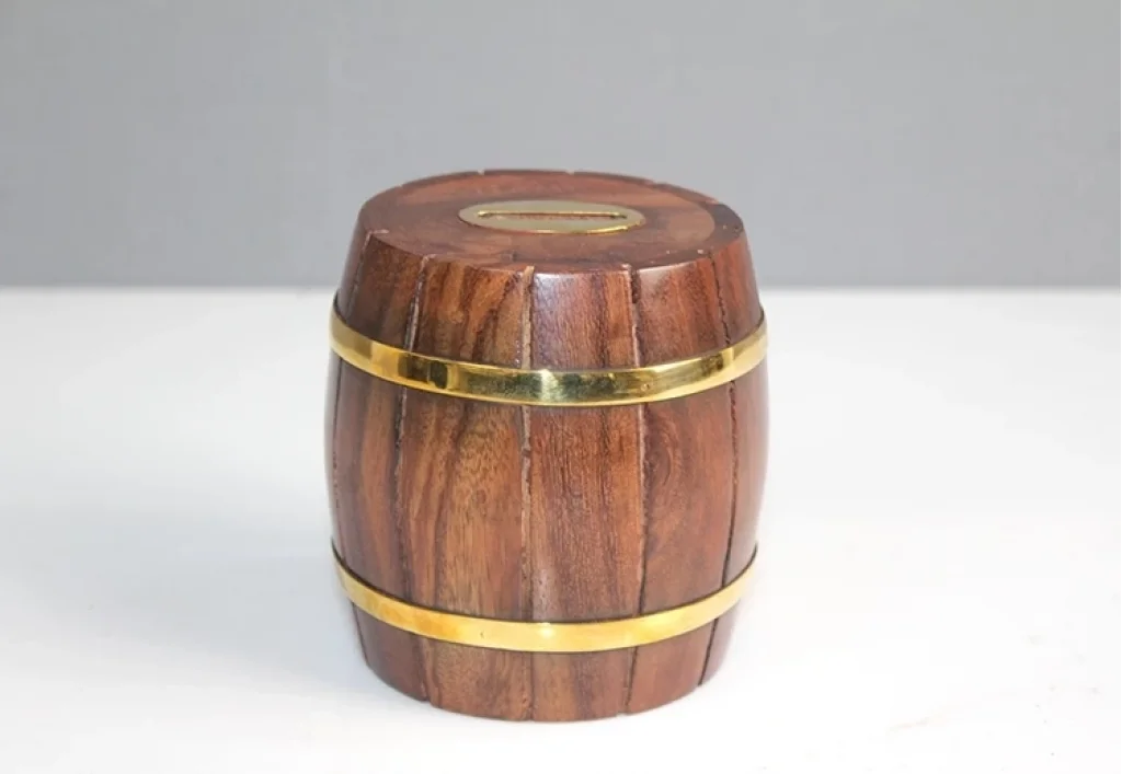 Pirinç Ahşap Fıçı Kumbara 15 Cm Wb538