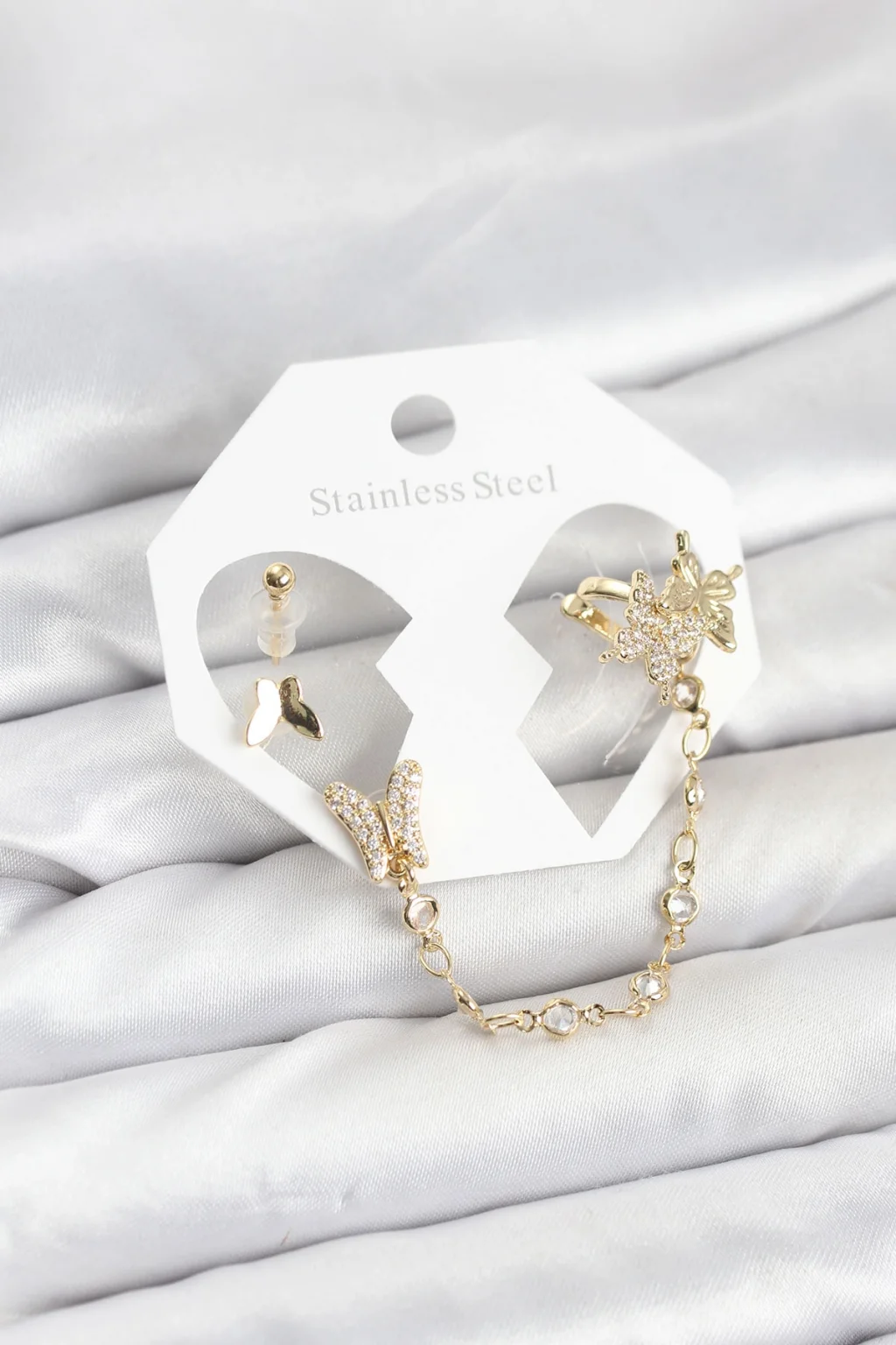Pirinç Gold Renk Kelebek Model Zincir Bağlantılı Ear Cuff Küpe Seti