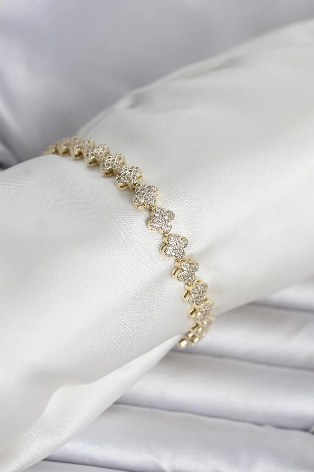 Pirinç Gold Renk Yonca Model Sıralı Zirkon Taşlı Kadın Bileklik