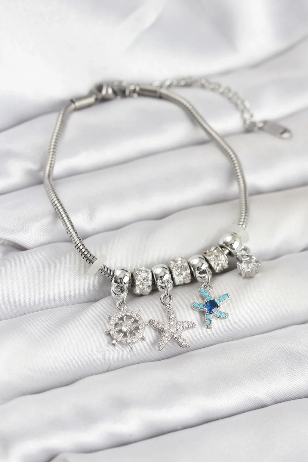 Pirinç Gümüş Renk Deniz Tema Charmlı Kadın Bileklik