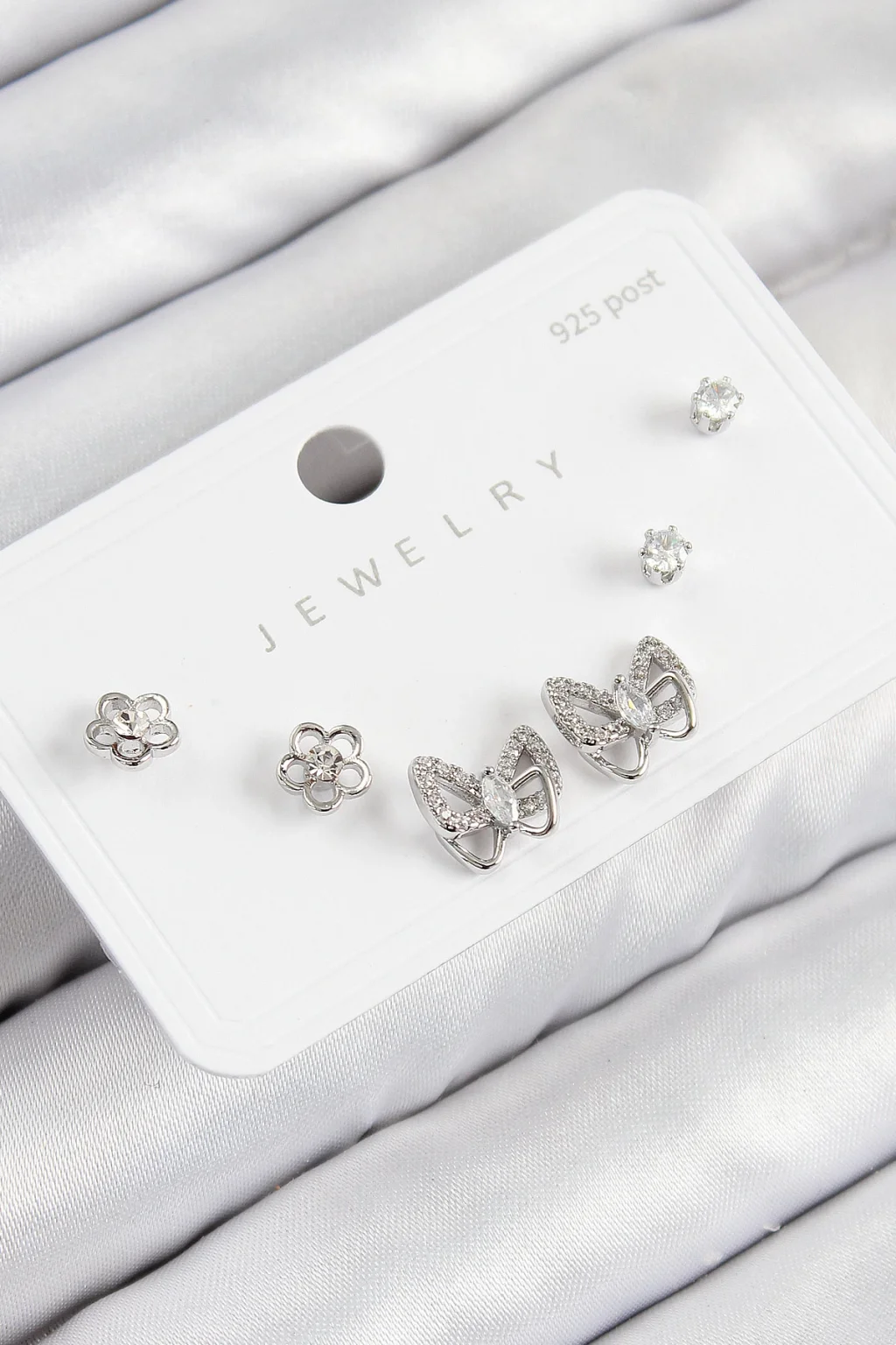 Pirinç Zirkon Taşlı Kelebek Model Gümüş Renk 925 Ayar Gümüş Çivi Kadın Küpe Set