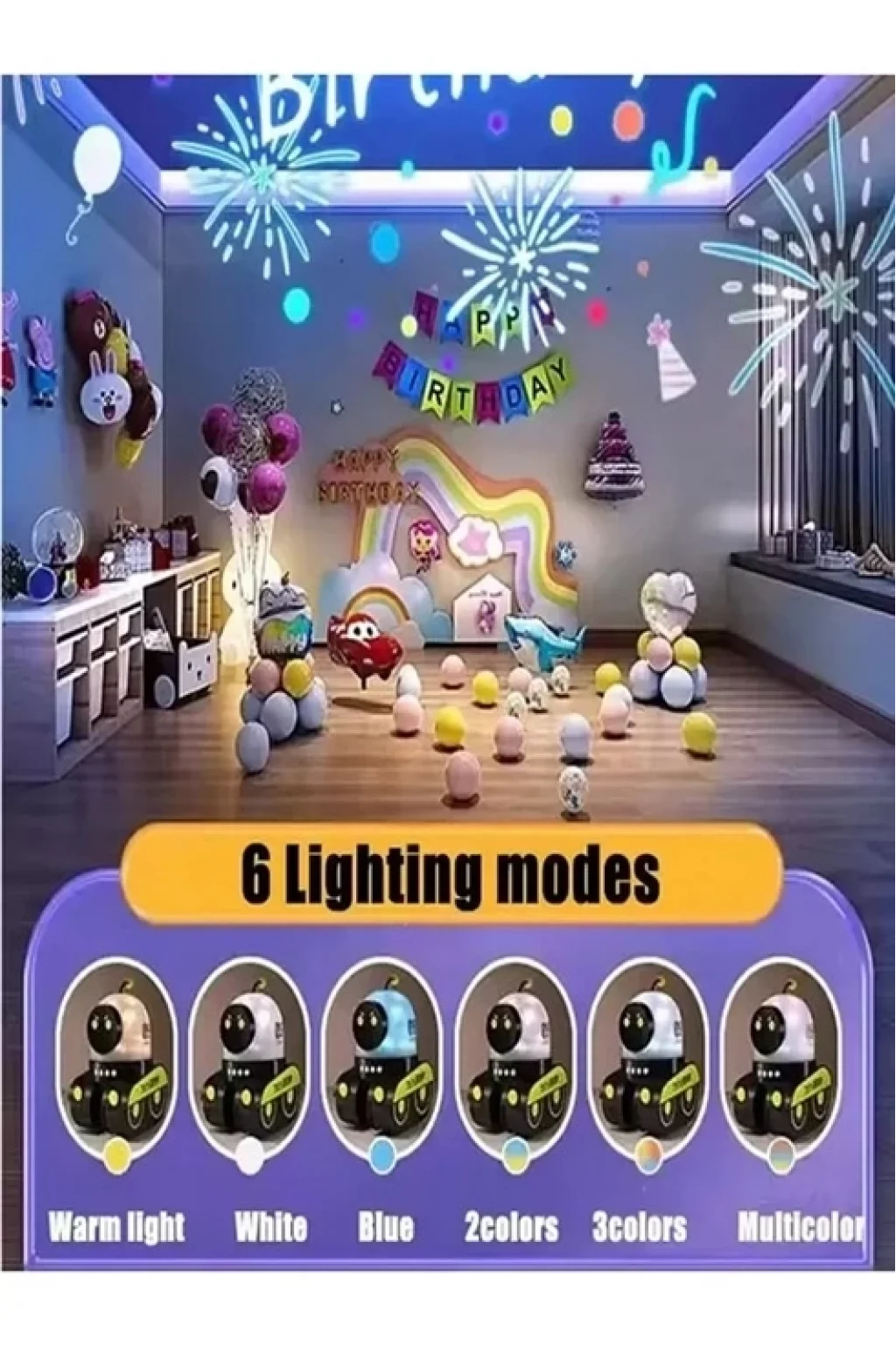 ÇOKLU AYDINLATMA MODLARI: Projeksiyon için 5 farklı renk seçeneği ve 12 film deseni sunarak görsel deneyimin özelleştirilmesine olanak tanır.