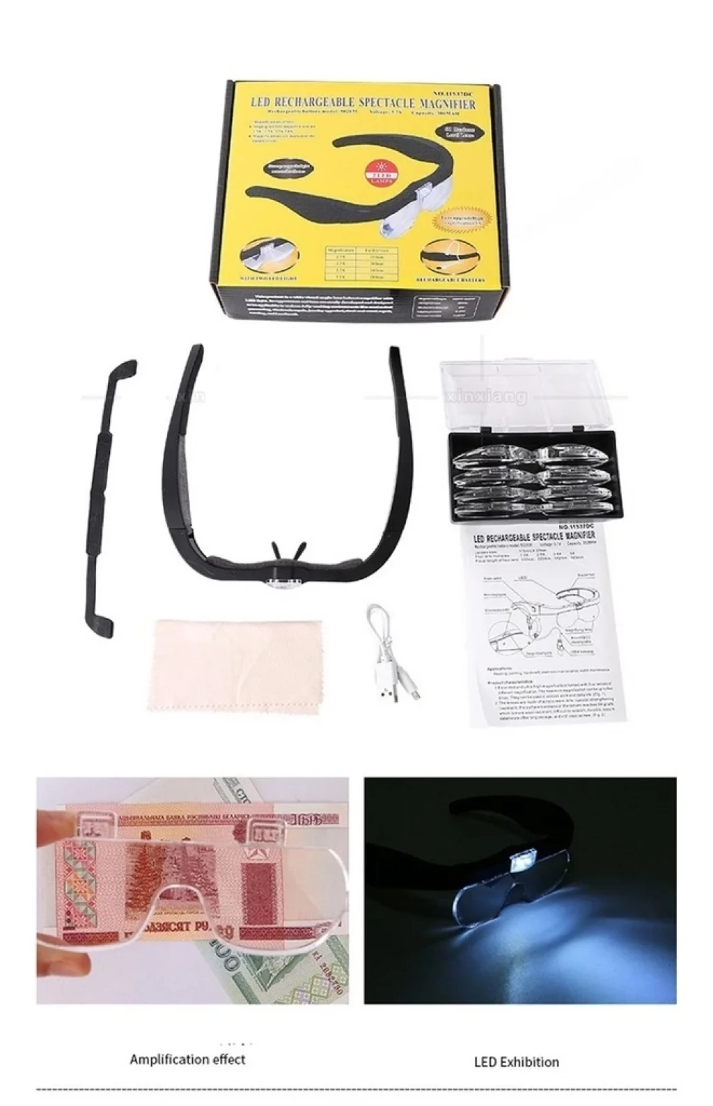 4 Lensli Şarjlı Led Işıklı Gözlük Büyüteç Bu ürün Türkiye'de sadece bizim online mağazalarımızda satılmaktadır. Bu gözlük büyüteçte lensleri kullanarak farklı yakınlaştırma ve odaklamalar elde edebilirsiniz. Hobi işlerinizde, tamir ve makyaj işlerinizde, tekstil sektöründe kalite kontrol aşamasında, okuma ve dikkat gerektiren tüm işlerinizde, kuyumculuk ve takı faaliyetlerinde, tarım ve botanik sektöründe, sağlık sektöründe kullanabileceğiniz çok yönlü led aydınlatmalı gözlük büyüteçtir. Gözlük büyütecin içinden standart olarak çıkan merceklerin yakınlaştırma oranlarının odak mesafaleri aşağıdaki gibidir. 1,5x lens ile 333mm uzaklıktan odaklanmaktadır. 2,5x lens ile 200mm uzaklıktan odaklanmaktadır. 3,5x lens ile 142mm uzaklıktan odaklanmaktadır. 5x lens ile 100mm uzaklıktan odaklanmaktadır. Farklı lensleri kullanarak farklı yakınlaştırma ve buna bağlı olarak farklı odak mesafeleri elde edersiniz. Görme bozuklukları olan kişiler için büyüteç görme yetisi kazandırmaz. Büyütecin görevi sadece nesneyi büyütüp daha detaylı bir çalışma ve görme alanı oluşturmaktır. Görme probleminiz olduğunu düşünüyorsanuz doktorunuza başvurunuz. Ürünü kutu içeriğinde bulunan micro USB 2.0 kablosu ile şarj edebiliriniz. Paket içeriği 1 gözlük çerçevesi Özel kutusunda 4 Adet lens Resimli kullanma kılavuzu
