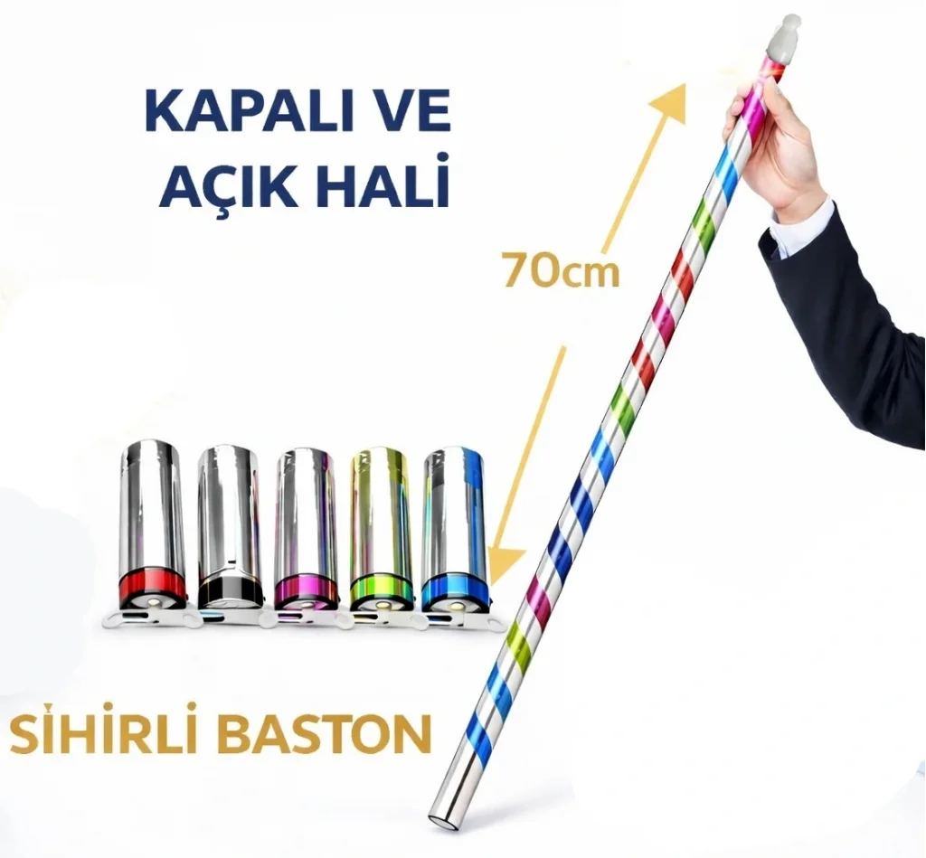 Bu özel sihirbazlık malzemesi sayesinde elde küçük ve masum görünen bir kapsül, tek hamlede anında 70 cm uzunluğunda şık ve renkli bir bastona dönüşür. Aynı şekilde tekrar katlanarak küçük boyutuna geri döndürülebilir. Gösterilerde ani etki yaratmak için mükemmel bir ilizyon aracıdır.