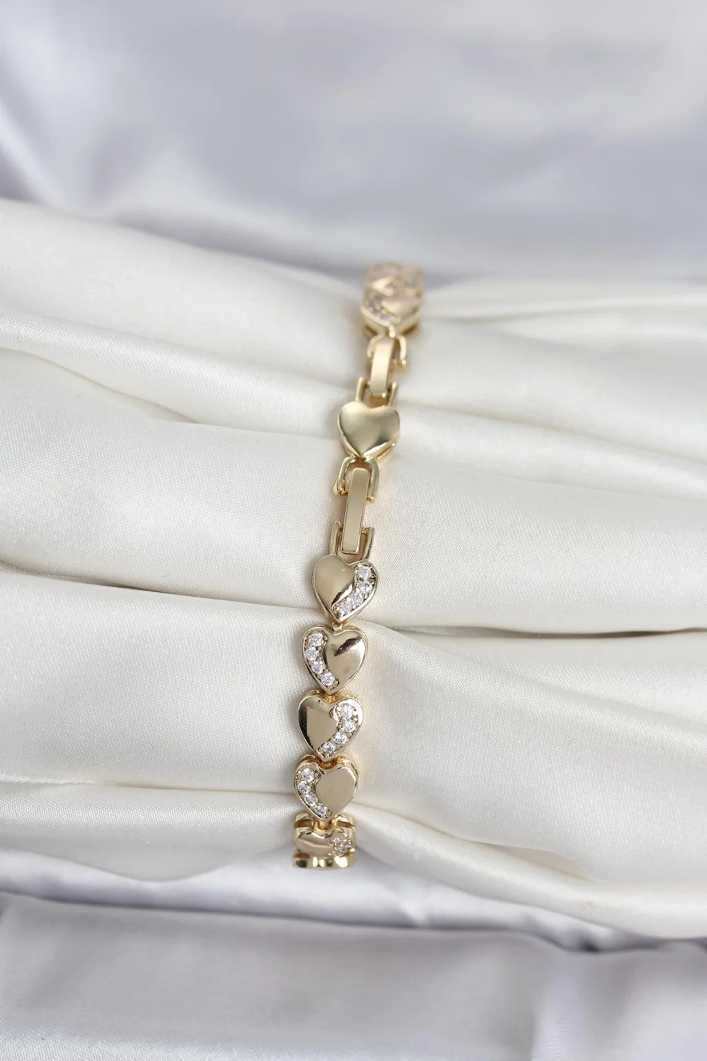 Pirinç Gold Renk Kalp Model Sıralı Zirkon Taşlı Kadın Bileklik