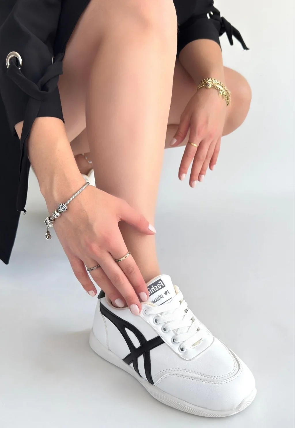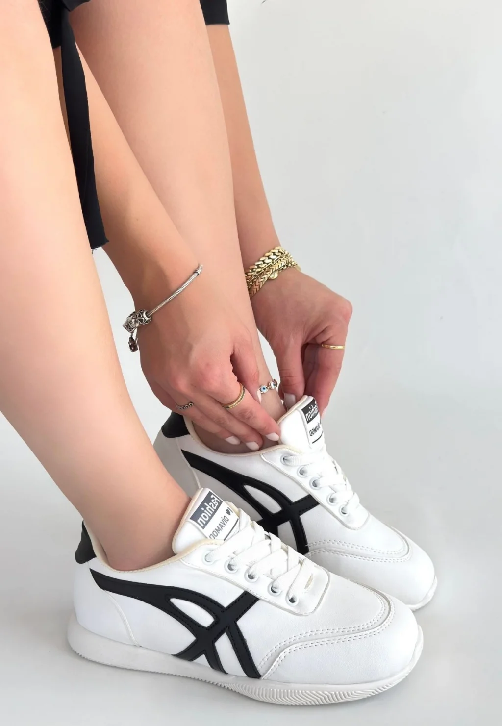 Zlay Beyaz Cilt Siyah Detaylı Bağcıklı Spor Ayakkabı